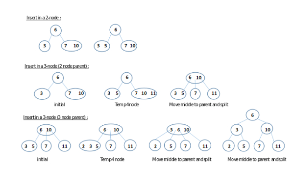 插入透過搜尋鍵的正確位置並將其新增到該位置來執行。如果節點變成 4-節點,則該節點將被分成兩個 2-節點,中間鍵將被移動到父節點。然後父節點可能會變成 4-節點,在這種情況下,它也會被分割,並將鍵傳播到其父節點。此過程重複進行,直到我們到達不需要分割的 2-節點父節點,或者到達根節點,在這種情況下,我們將傳播的元素實現為建立一個新的 2-節點根節點。藉助此演算法,執行的運算元量與樹的高度成正比,因此由於樹是完全平衡的,所以是對數級的。此過程確保其結果為 2-3 樹:特別是,所有葉子節點都保持在相同的深度。