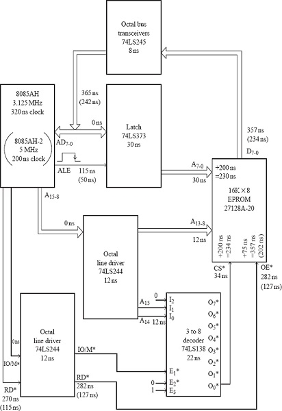 因此,27128-20 EPROM 晶片的速度與 8085AH 相容。因此,8085AH 與記憶體晶片介面,這些晶片具有如下所示的最壞情況規格