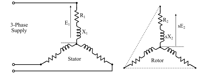 轉子電路的電阻為每相 R2,與頻率無關,因此不依賴於滑差。類似地,定子繞組的電阻 (R1) 和電抗 (X1) 不依賴於滑差。
