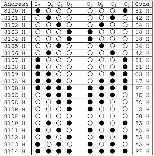 模式儲存在8100H地址及以後的位置。我們使用8255埠IC在LED顯示器上顯示內容。顯示完成後,它呼叫延遲函式等待一段時間,然後從記憶體呼叫下一個位元組進行顯示。因此,顯示模式如下所示: