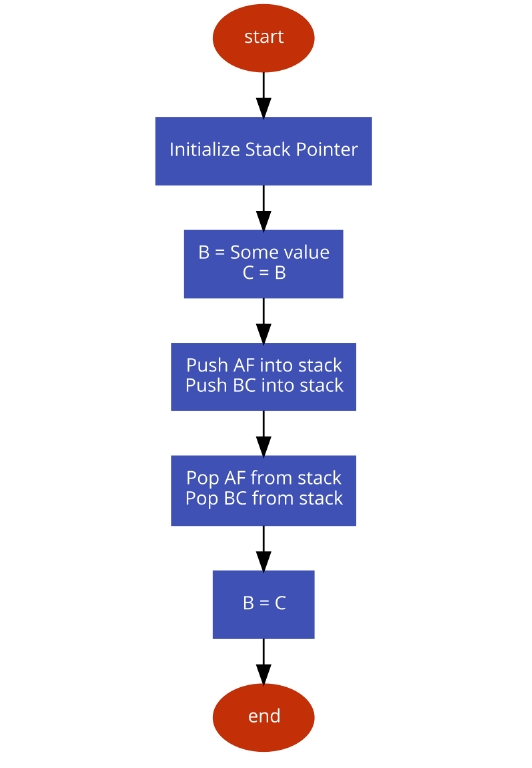 這裡,如果我們想要交換B和F的值,那麼首先必須將B的副本複製到C。當我們將PSW壓入堆疊時,然後彈出到BC,累加器的內容將載入到B,標誌暫存器的內容將載入到C。