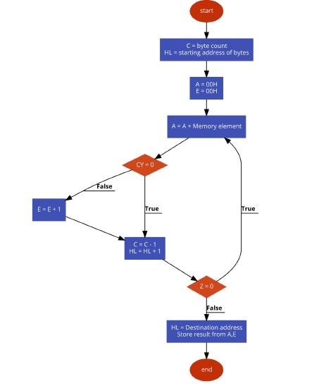 我們反覆從記憶體中獲取數字,然後將其與累加器相加,並在進位標誌設定時增加暫存器 E 的內容。最初,E 被清零。