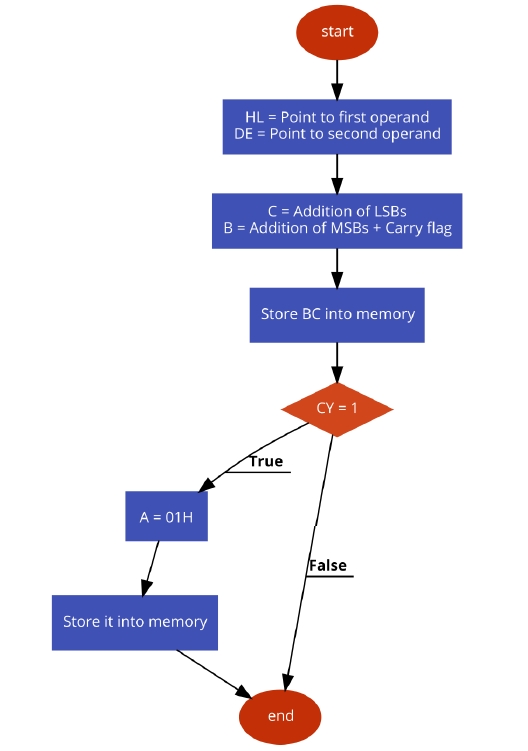 在本程式中,我們使用HL和DE暫存器對指向運算元地址。然後使用ADD運算子新增LSBytes,然後使用ADC運算子新增MSBytes以考慮進位標誌結果。16位結果將儲存在BC暫存器中,並且透過檢查加法後的進位位,我們可以簡單地將1放入記憶體中。