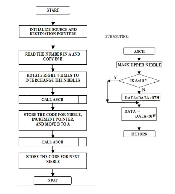 在這個問題中,我們使用一個子程式將一個BCD數字(半位元組)轉換為其等效的ASCII值。由於8位BCD數包含兩個半位元組,因此我們可以執行此子程式以找到它們的ASCII值。我們可以透過遮蔽高半位元組很容易地獲得低半位元組,對於高半位元組,我們首先必須遮蔽低半位元組,然後將暫存器內容向右旋轉四次,現在我們可以將其更改為ASCII值。