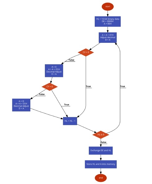 這個問題透過實現 16 位計數器來解決。我們首先儲存 16 位數,然後逐個減少數字,並透過調整十進位制值來增加十進位制值。要增加值,我們可以使用 INR 指令,但 INR 指令不影響進位標誌。因此,這裡我們使用 ADI 01H 將其增加 1。
