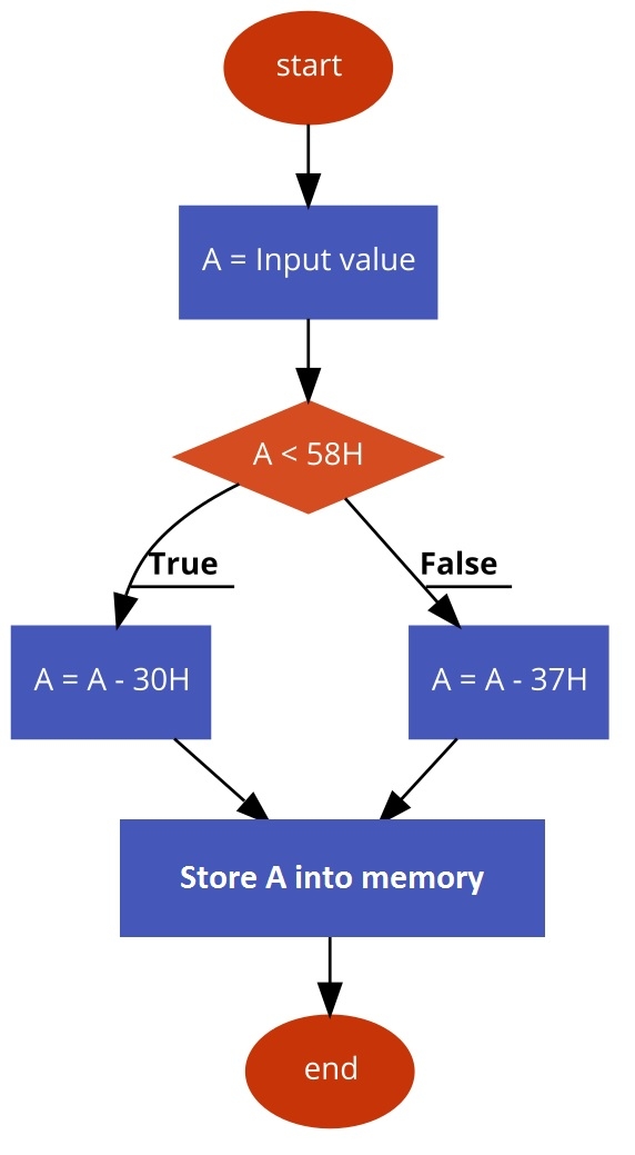 這裡的邏輯很簡單。我們正在檢查ASCII值是否小於58H(9的ASCII+1)。當數字小於58時,它是一個數值。因此,我們只需從ASCII值中減去30H,而當它大於58H時,它就是字母值。因此,為此,我們正在減去37H。