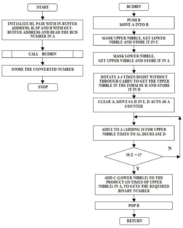 在這個問題中,我們從記憶體中獲取一個BCD數並將其轉換為其二進位制等價物。首先,我們擷取輸入的每個半位元組。因此,如果輸入是52(0101 0010),那麼我們可以透過將該數與0FH和F0H進行掩碼來簡單地擷取它。當擷取高位半位元組時,將其左移四位以將其傳輸到低位半位元組。