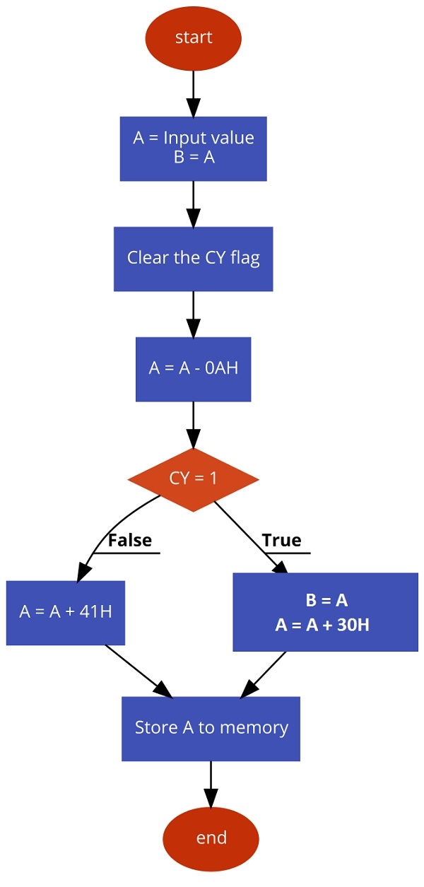 在程式中,首先我們清除進位標誌。然後從給定的數字中減去0AH。如果該值是數字,則減法後的結果將為負數,因此進位標誌將被設定。現在透過檢查進位狀態,我們可以簡單地將30H與該值相加以獲得ASCII值。