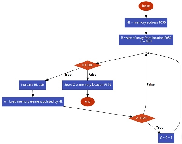 在本節中,我們將使用8085統計小於0AH的元素個數。