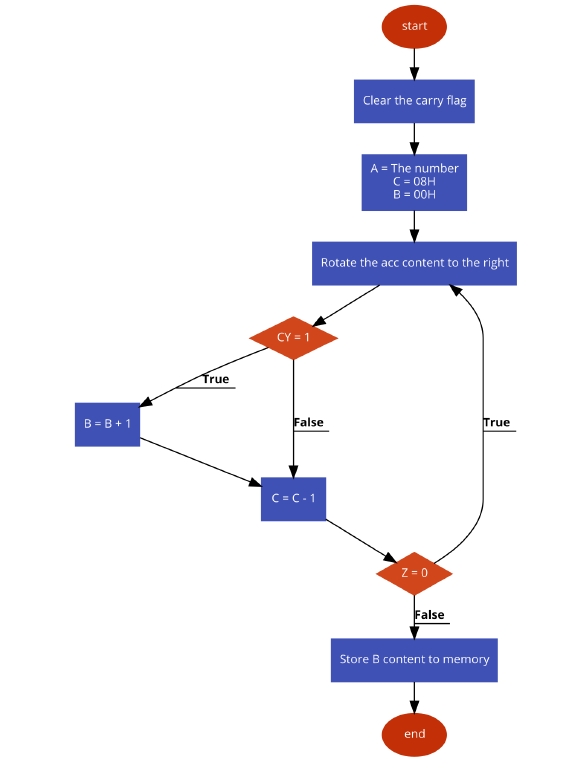 在這個程式中,我們使用旋轉操作來計算1的個數。由於8位數有8個不同的位,因此我們將數字旋轉8次。我們可以使用RRC或RLC。這裡我們使用了RRC指令。此指令將LSb傳送到MSb以及進位標誌。因此,在每次迭代之後,我們可以檢查進位狀態以獲得1的計數。