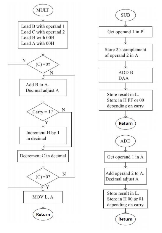 在這個程式中,我們選擇一個選項。選項值儲存在記憶體位置8000H(命名為X)。BCD數儲存在位置8001H和8002H。我們將結果儲存在位置8050H和8051H。