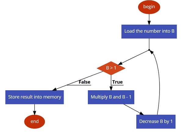 在8085中,沒有直接指令可以執行乘法。我們需要執行重複加法才能獲得乘法的結果。在每一步中,我們都在減小B的值並乘以B的上一個值。我們重複這些步驟,直到B達到1。並將B – 1至0。 因此生成階乘。