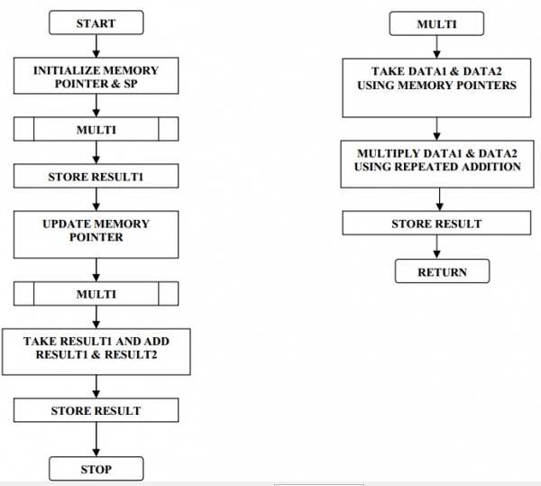 8085中沒有乘法指令。因此,我們必須使用子程式來執行乘法。在這個子程式中,它從HL對指向的記憶體中獲取數字,並將結果返回到DE暫存器對。在將兩個部分相乘後,儲存中間結果,然後將它們相加以獲得最終結果。