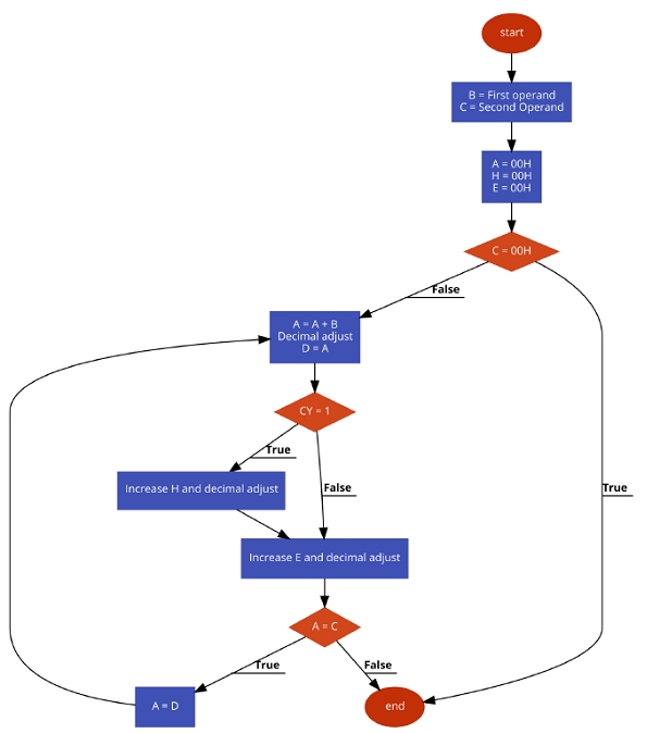 眾所周知,8085沒有乘法指令,因此我們必須使用重複加法方法。在這個過程中,在每次加法之後,我們都會調整累加器值以獲得十進位制等價物。當存在進位時,我們會增加MS-Byte的值。 我們可以使用INR指令進行遞增,但這裡使用ADI 01H。INR指令不影響CY標誌,因此我們需要ADI指令。