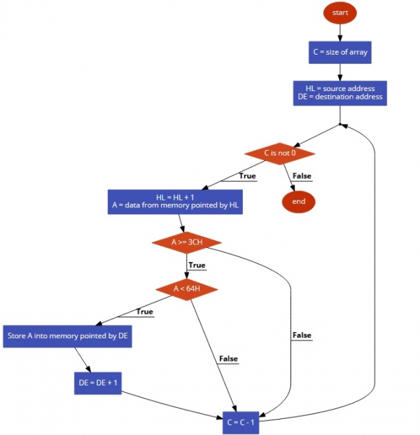 為了解決這個問題,我們將從記憶體中獲取數字。然後將其與3C進行比較。如果進位標誌被設定,則表示該數字小於3C,因此只需跳過它。否則將其與64H進行比較,現在如果進位標誌未設定,則表示該數字較大,因此跳過它,否則我們將數字儲存到正確的位置。