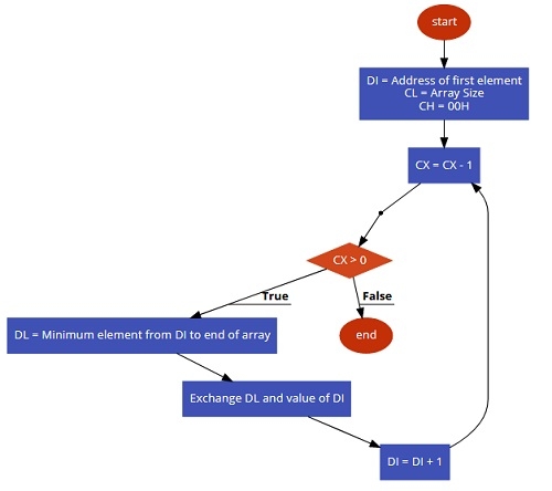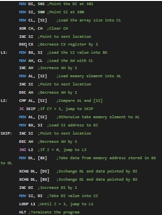 編寫8086組合語言程式,使用選擇排序技術對給定陣列中的元素進行排序。陣列從記憶體偏移量501開始。序列的大小儲存在記憶體偏移量500中。