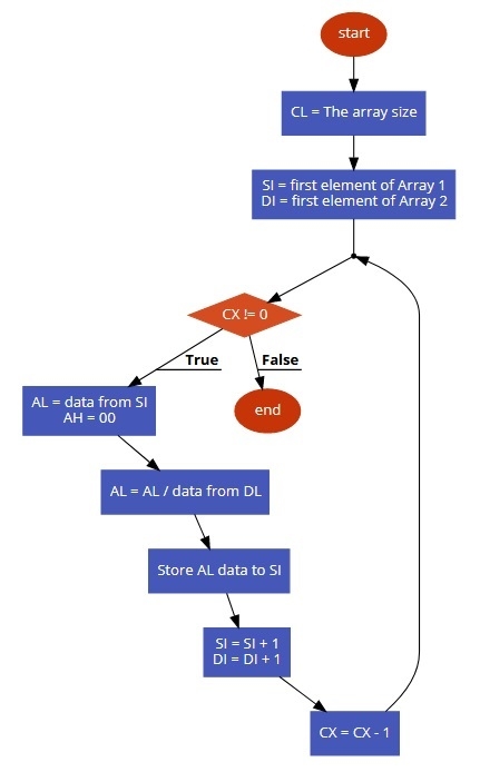 MOV SI, 500 ;Point Source index to 500 MOV CL, [SI] ;Load the array size into CL MOV CH, 00 ;Clear Upper half of CX INC SI ;Increase SI register to point next location MOV DI, 601 ;Destination register points to 601 L1: MOV AL, [SI] ;Load A with the data stored at SI MOV AH, 00 ;Clear upper half of AX DIV [DI] ;Subtract AX by DI MOV [SI], AH ;Store AH to SI address INC SI ;SI Point to next location INC DI ;DI Point to next location LOOP L1 ;Jump to L1 until the counter becomes 0 HLT ;Terminate the program
