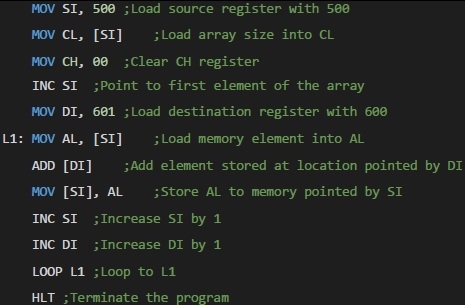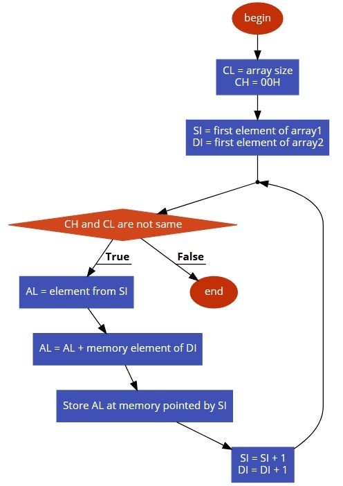 為了解決這個問題,我們使用源暫存器SI從第一個陣列中獲取元素,使用目標暫存器DI從第二個陣列中獲取元素。重複地將SI中的元素取到AL中,然後與DI的內容相加,再儲存回SI地址。 因此解決了。