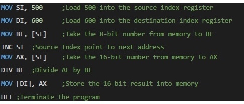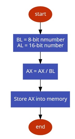 8086 具有 DIV 指令來執行除法。將 8 位數放入 BL,將 16 位數放入 AX。現在,將 AX 除以 BL。結果將儲存在 AX 中。