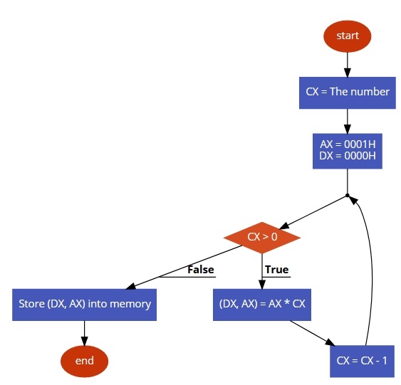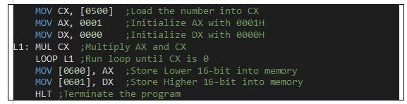 在這個程式中,我們將數字放入計數器暫存器,然後遞減並相乘。如果結果超過16位範圍,則可以在暫存器DX和AX中找到32位結果。之後,我們將結果儲存到記憶體偏移地址600和601。