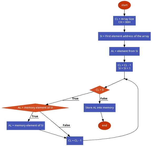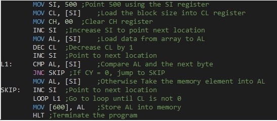 首先,我們從記憶體偏移地址500獲取陣列的大小。然後使用該大小,我們將計數器初始化為讀取並檢查所有數字。我們將第一個數字放入AL暫存器,然後檢查每個數字並將其與AL暫存器中的值進行比較。如果AL暫存器中的值大於陣列元素,則用陣列元素更新AL暫存器。否則跳過該元素並指向下一個元素。這樣就找到了最小元素。