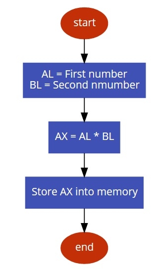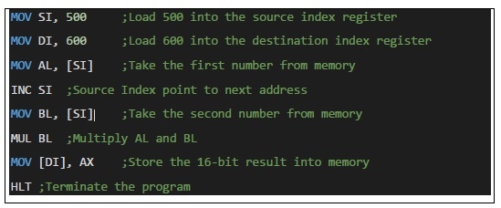 8086 中有 MUL 指令。因此,這項任務非常簡單。這裡我們從記憶體中獲取數字,然後執行乘法運算。由於使用了 8 位數,因此在乘法之後,AX(16 位)將儲存結果。