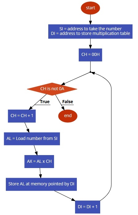 表生成基本上就是建立乘法表。我們獲取數字並將計數器初始化為 0。在每一步中,將計數器遞增 1,再乘以數字,然後將其儲存到記憶體地址中。當計數器變為 0A(十進位制 10)時,它停止。