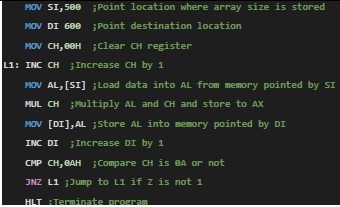 編寫 8086 程式,以生成輸入整數的表。該數字儲存在 500H,表將儲存在 600 及其以後。
