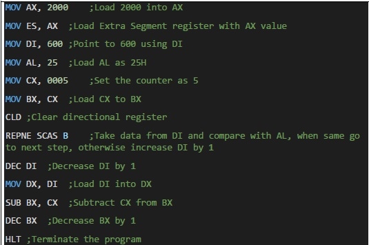 在本教程中,我們只使用 5 個數字。我們要搜尋數字 25。在搜尋成功後,DX 暫存器將儲存偏移地址,BX 暫存器將儲存該數字的索引。