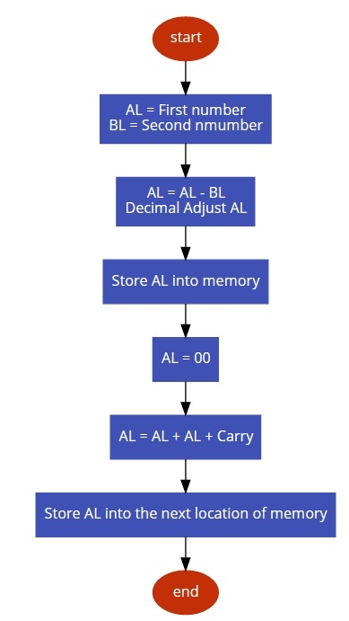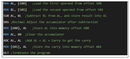 此任務非常簡單。此處,我們從記憶體中獲取數字,以及在相減操作之後,我們需要新增 DAS 指令以將累加器內容調整為十進位制形式。DAS 將檢查 AC 和 CY 標誌以將數字調整為其十進位制形式。