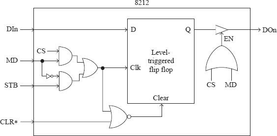 8212依賴於邊沿觸發的D型觸發器。我們稱之為服務請求觸發器。它負責在INT*引腳上生成中斷請求。INT*是一個低電平有效的輸出引腳,在中斷驅動的資料傳輸方案中很有用。負責啟用INT*訊號的內部架構如下所示