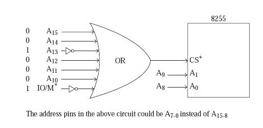 8255 可以連線到微型計算機系統中,作為記憶體對映 I/O 或 I/O 對映 I/O。假設我們希望 8255 連線為 I/O 對映 I/O,埠 A、埠 B、埠 C 和控制埠的地址分別為 20H、21H、22H 和 23H。然後,一個可能的晶片選擇電路如圖所示。在此圖中,A7-0 可以代替 A15-8 使用。