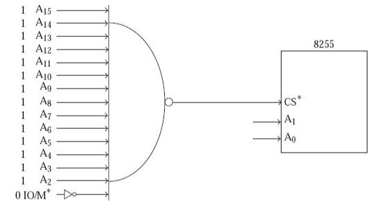 類似地,假設我們希望 8255 連線為記憶體對映 I/O,埠 A、埠 B、埠 C 和控制埠的地址分別為 FFFCH、FFFFH、FFFEH 和 FFFFH。然後,一個可能的晶片選擇電路如圖所示。在此圖中,A7-0 是使用 8212 或 74LS373 作為地址鎖存器生成的地址的低位元組。