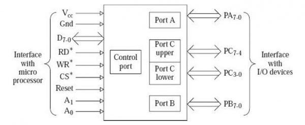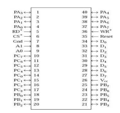 Intel 8255 是一款可程式設計的外設介面 (PPI) 晶片。它用於連線外設和介面。我們將外設也稱為輸入輸出裝置。我們使用輸入輸出埠連線輸入輸出裝置。因此,8255 是一款可程式設計的輸入輸出埠晶片。它是一款 40 引腳晶片,可用於雙列直插封裝。其工作需要 +5 伏直流電源。它包含兩個 8 位的可程式設計輸入輸出埠和兩個 4 位的可程式設計輸入輸出埠。我們分別稱它們為埠 A、埠 B、埠 C 上半部分和埠 C 下半部分。當這些引腳被程式設計為輸出引腳時,它們會在 1.5V 時提供 1mA 的電流。