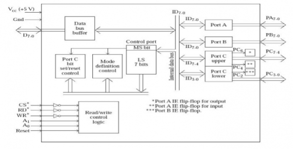 8255 執行三種操作模式,分別是模式 0、模式 1 和模式 2。我們將模式 0 稱為簡單輸入輸出或基本輸入輸出,用於執行最簡單的操作模式。8255 的每個埠都可以被程式設計為在模式 0 下工作。我們將模式 1 稱為鎖存輸入輸出或握手輸入輸出。當資料以不規則的時間間隔由微處理器提供給輸入裝置時,它很有用。最後,當資料被處理器讀取時,埠通知輸入裝置處理器已經讀取了資料。