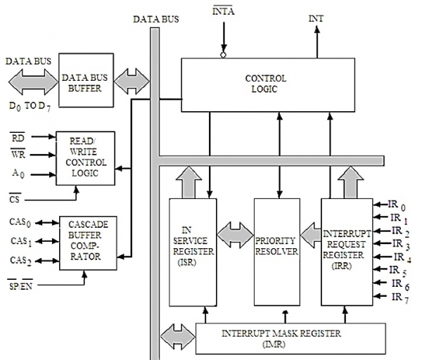 | 控制邏輯 | 它控制每個模組的功能。它有一個名為 INTR 的引腳,用於連線到其他微處理器以接收中斷請求。INT 引腳用於提供輸出。如果 8259 已啟用,並且其他微處理器的中斷標誌也為高電平,則這會導致輸出 INT 引腳的值變為高電平,透過這種方式,該晶片可以響應其他微處理器發出的請求。 |