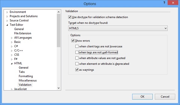 對於 HTML5 驗證,你需要為 Visual Studio 安裝 IntelliSense 和驗證支援。HTML5 受到 Visual Studio 2012 的支援。