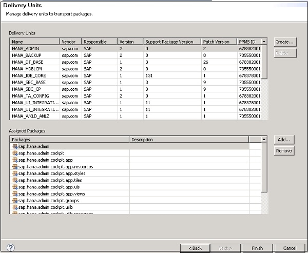 使用者應在使用交付單元之前建立它。這可以透過 HANA Modeler -> 交付單元 -> 選擇系統和下一步 -> 建立 -> 填寫詳細資訊(如名稱、版本等)-> 確定 -> 將包新增到交付單元 -> 完成來實現。