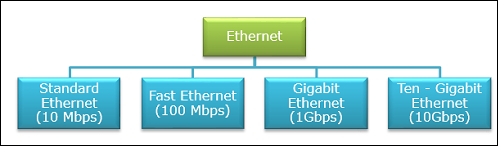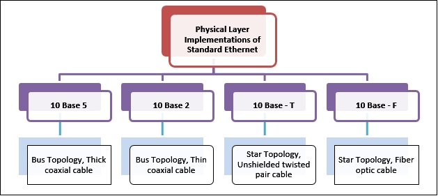標準乙太網具有許多物理層實現。四個主要的物理層實現如下圖所示