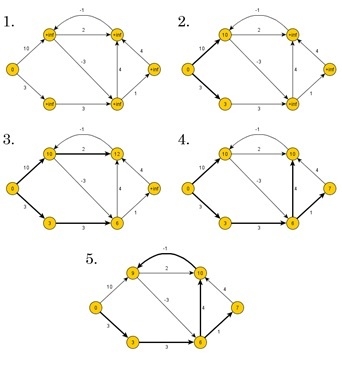 貝爾曼-福特演算法以自底向上的方式找到距離。首先,它會找到路徑中只有一條邊的那些距離。然後增加路徑長度,找到所有可能的解。