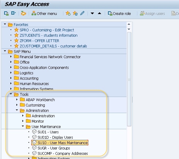 工具 → 管理 → 使用者維護 → 使用者批次維護。在 SAP 系統中,您可以在使用者維護下找到可用於不同目的的不同事務。