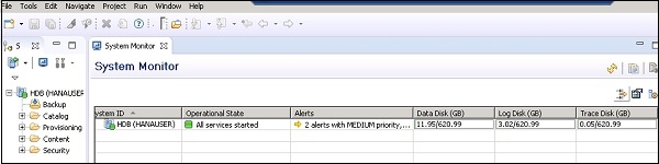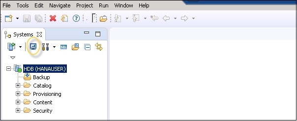 要開啟系統監視器,請在系統窗格中選擇 HANA 系統,然後單擊如下所示的圖示 -