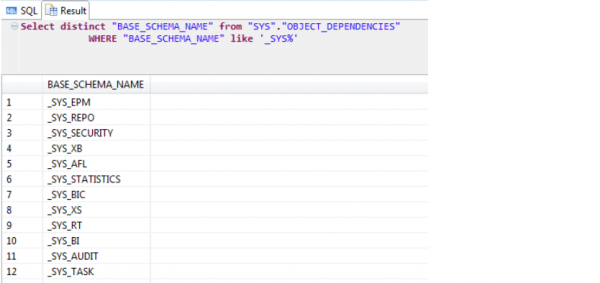 select distinct BASE_SCHEMA_NAME from "SYS"."OBJECT_DEPENDENCIES" where BASE_SCHEMA_NAME like ‘_SYS%’;
