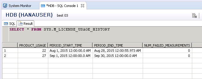 此詳細資訊可在系統檢視- SYS.M_LICENSE_USAGE_HISTORY 中檢視