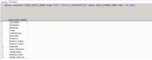 Select distinct BASE_OBJECT_NAME from "SYS"."OBJECT_DEPENDENCIES" where BASE_SCHEMA_NAME like 'AF_HANA';