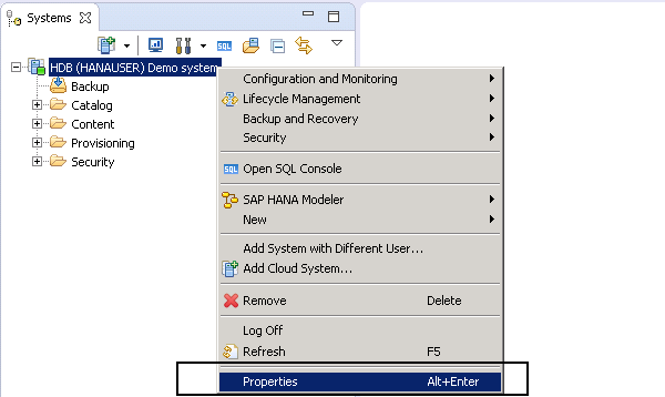 在 SAP HANA Studio 中,選擇 HANA 系統並右鍵單擊。從列表中選擇最後一個選項屬性,如下所示:-