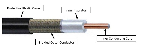 同軸電纜有一個由硬質銅導體組成的中心芯,用於傳輸訊號。它由絕緣材料覆蓋。絕緣體由緊密編織的遮蔽金屬外導體包裹,該外導體充當抗噪聲的遮蔽層。外導體又包裹在塑膠絕緣層中。圖示如下:−