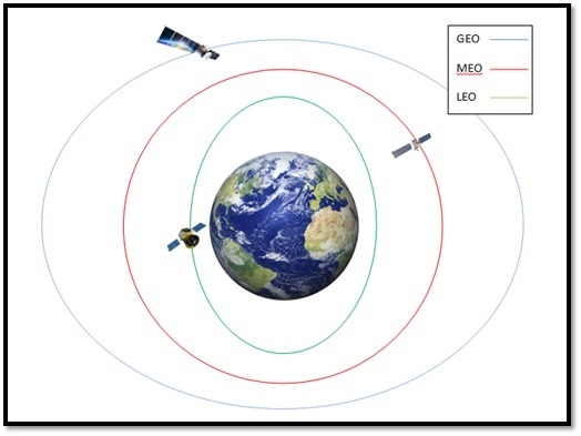 中地球軌道衛星 (MEO) − 它們放置在兩個範艾倫輻射帶之間,距離地球表面 2,000 公里至 36,000 公里。全球覆蓋需要至少 10 顆 MEO。