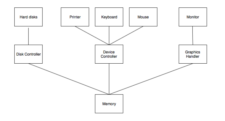 - 有多個裝置控制器,每個控制器負責一個特定的裝置,例如鍵盤、滑鼠、印表機等。