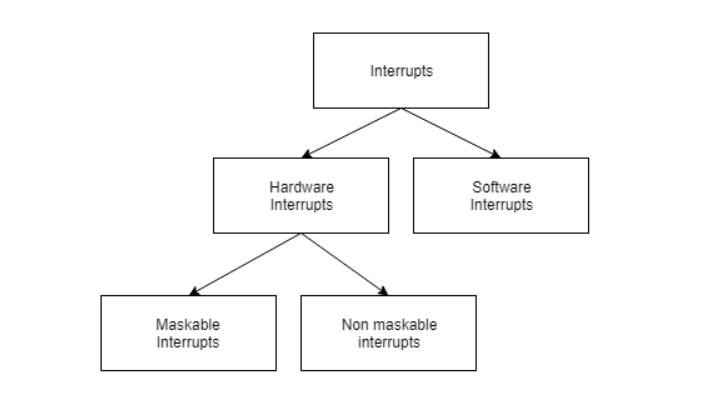 裝置或程式可以生成中斷,以通知作業系統停止其當前活動並關注其他事情。以下圖表更好地解釋了中斷的型別: